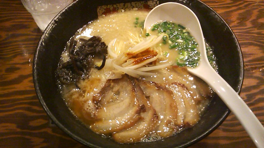 結論から言うと、すごく好きなラーメンでした。 やっぱり、とんこつが好きなのかなぁ…。 とんこつの「こく味」にチャーシューをトッピングしました。 ネギがレンゲに丸っと入っているのが見た目に気に入りました。 家で何か作ったときはやろうと思います。 これこそが、とんこつ、という感じのラーメンです。 紅ショウガがとってもあう。 こってりしてるのに、気が付いたら半分以上スープを飲んでいました。 気が付いたらスープがなくなっているラーメン=ウマいラーメン、という考えを持っています。 理屈じゃないんですね。無意識にウマいと感じていたようです。 しかし、せっかくトッピングしたチャーシューですが、 薄いのにとろとろすぎて、何となく損した気がしました。 トッピングは肉より玉子がいいと思います。 ラーメンが出てくるまで、 キムチもやしと高菜をどうぞ!! って言ってくれました。 こういうところ、結構いいですね。 1人でラーメン食べに来ると結構、暇なんだよなぁ…。 また行こう。